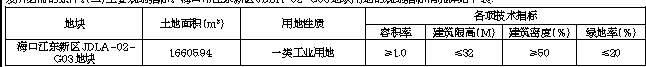 经海口市人民政府批准,海口市自然资源和规划局决定以挂牌方式出让海口市江东新区1幅国有建设用地使用权。现将有关事项公告如下:一、地块的基本情况和规划指标要求:(一)基本情况和宗地净地情况。本次挂牌出让的宗地位于海口市江东新区JDLA-02-G03地块,面积为16605.94平方米(24.91亩),土地用途为工业用地,出让年限为50年。已经琼府委托(海江东)〔2022〕28号文批准办理农转用及征收手续。目前地块安置补偿落实到位、地上附着物已清表、土地权利清晰、无法律经济纠纷、土地开发利用规划条件明确、土壤无污染,具备动工开发所必需的条件。(二)主要规划指标。海口市江东新区JDLA-02-G03地块用地的规划指标情况详见下表: