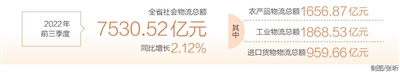 记者了解到,2022年前三季度,全省完成社会物流业总收入759.55亿元,同比增长2.56%。从结构来看,交通运输、仓储和邮政业558.15亿元,同比增长4.45%;工业内部物流69.24亿元,同比增长9.28%;批发零售业内部物流132.16亿元。