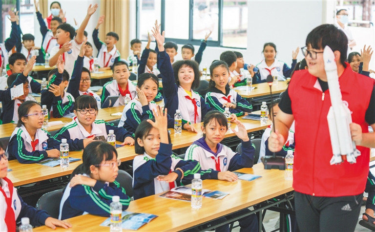 11月9日,在文昌市龙楼镇航天大社区,航天科普志愿者用通俗易懂的语言、丰富的案例,传播航天精神、弘扬航天文化,引导学生积累科学文化知识,培养创新思维,增进孩子们的民族自豪感和对科技强国的坚定信心。本报记者 袁琛 摄