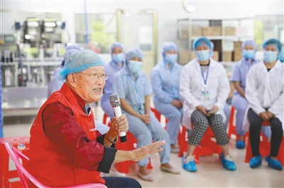 就在20多分钟前,工人们还在这里忙着打包新鲜出炉的咖啡粉。此刻,车间里却已摆满了60多个小红椅,工人们围坐在一起,静静聆听文昌市侨乡归侨宣讲团成员、退休教师云凰宣讲党的二十大精神。