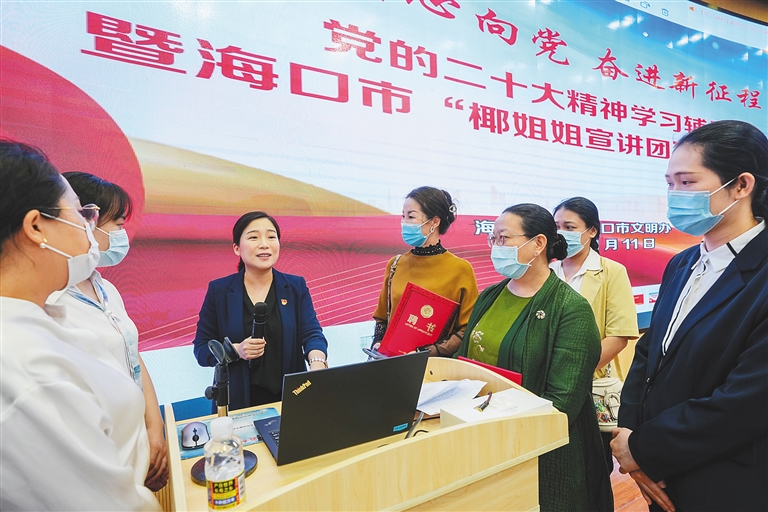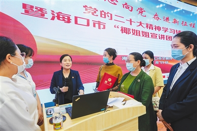 海口市妇联主席、“椰姐姐宣讲团”团长郑艳说,接下来,将带领宣讲团成员一起,学深悟透党的二十大精神,并立足自身岗位、立足女性发展,深入机关、校园、企业、馆区、社区、农村等基层一线,以及港澳台侨妇女群体中,开展一系列有创意、多形式、接地气的宣传活动,为党的创新理论扎根椰城、深入民心贡献巾帼力量。