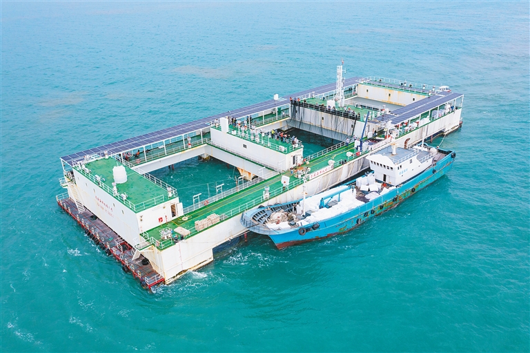 这是乐东龙栖湾国家级现代智慧海洋牧场项目建设的“普盛海洋牧场1号”,作为海南首座深远海智能养殖旅游平台,经过7个月的深海养殖,日前该平台捕捞首批渔获约75万斤,基本实现预期产量。
