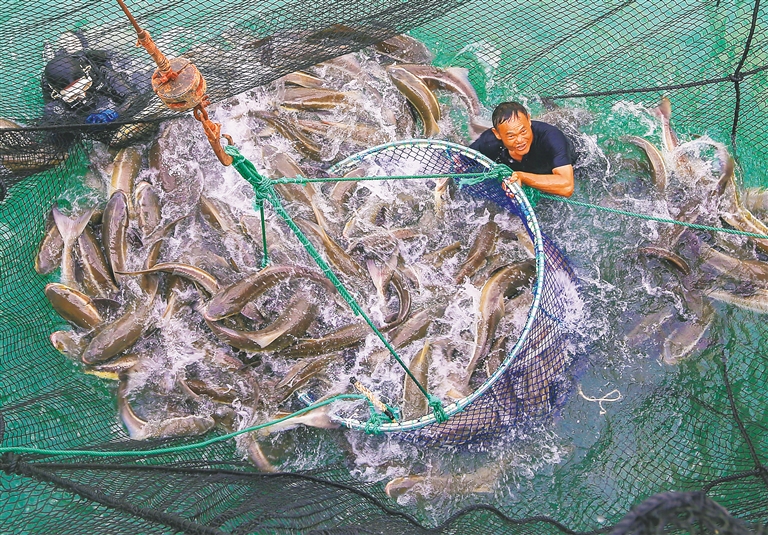 经过7个月的深海养殖,日前该平台捕捞首批渔获约75万斤