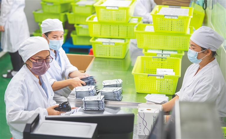 日前,位于定安县的海南百迈科医疗科技股份有限公司内,工作人员在打包可吸收性外科缝线产品。该公司是一家研发、生产、销售医疗器械产品的高新技术企业,为我省首批“专精特新”企业。