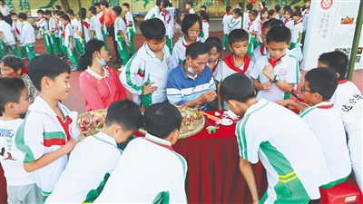 学校操场设置了“定安粽子”“对岁粿习俗”“定安菜包饭”3个定安县县级非遗代表性项目体验区,每个体验区都有一位传承人现场展示。现场还设置了展板,图文并茂介绍该县2项国家级、2项省级、8项县级非物质文化遗产。