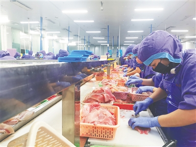 走进加工车间,一股寒气袭来,这是为罗非鱼出口营造的“氛围感”——制冷保鲜。车间内部,却是十分火热的繁忙场面。海南日报记者在现场看到,200多名工人穿着制服、戴着口罩,动作娴熟地对罗非鱼进行取肉、摸骨、分选、清洗、打包等工作。