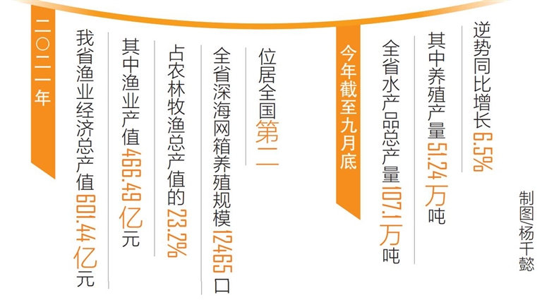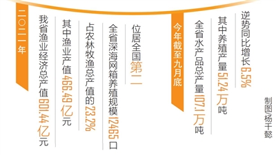 另据省农业农村厅提供的数据,2021年,我省渔业经济总产值601.44亿元,其中渔业产值466.49亿元,占农林牧渔总产值的23.2%。全省深海网箱养殖规模12465口,位居全国第二。今年截至9月底,全省水产品总产量107.1万吨,其中养殖产量51.24万吨,逆势同比增长6.5%,有效保障水产品稳定供给,为冲刺完成全年社会经济发展目标注入“蓝色动力”。