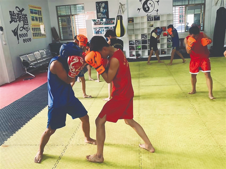 吴志品告诉记者,周一到周五,拳击班在白马井中学进行训练,主要进行体能和基本动作训练。周末则在健道门武术馆里训练,除了练习基本动作外,还进行打沙袋和实战对打等,增强身体对抗能力。