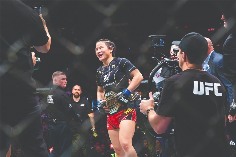 据新华社纽约11月12日电 12日,终极格斗冠军赛UFC281在纽约麦迪逊花园广场拉开战幕。中国选手张伟丽裸绞终结女子草量级现任冠军卡拉·埃斯帕扎,重夺金腰带。