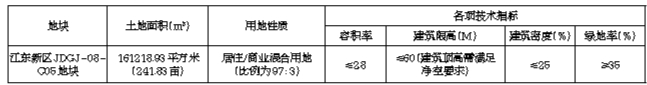 一、地块的基本情况和规划指标要求:(一)基本情况和宗地净地情况。本次挂牌出让的宗地位于海口市江东新区JDGJ-08-C05地块,土地面积为161218.93平方米(合241.83亩),土地用途为城镇住宅及零售商业混合用地(城镇住宅占97%,零售商业占3%),土地出让年限为城镇住宅用地70年,零售商业用地40年,用于建设安居房项目。目前地块安置补偿落实到位、地上附着物已清表、土地权利清晰、无法律经济纠纷、土壤无污染,具备动工开发必需的条件。(二)主要规划指标。海口市江东新区JDGJ-08-C05地块规划情况详见下表: