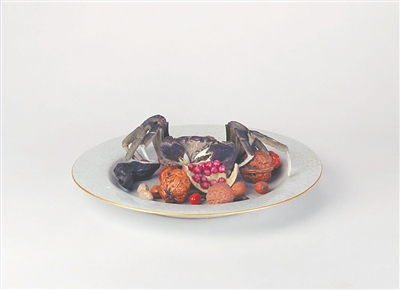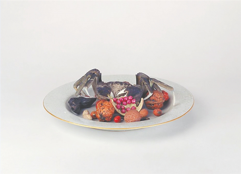 “一腹金相玉质,两螯秋江明月”。可能每年的食蟹季节总是在谈笑间倏忽而过,清代人为了解馋,便突发奇想,尝试用陶瓷将螃蟹的形象定格在烧熟的那一瞬间。这一试,还真成了!在现藏于故宫博物院的粉彩像生瓷果品盘中,我们看到了一只立体肥美的螃蟹,螃蟹周边散落着核桃、红枣、荔枝、瓜子、樱桃、菱角等吃食。想必前去参观的吃货隔着玻璃橱窗,也能体验到“双螯啰出琼酥香”的味觉感受。