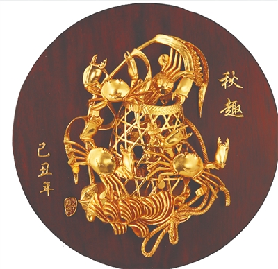 到了现代,又有广东潮州木雕大师辜柳希先生,捕捉到生活中充满喜悦的瞬间,以秋蟹绕篓为创作主题,以其高超的雕刻技艺营造出生机勃勃的画面感。这件名为“秋趣”的木雕作品雕工精细、浑然天成,传递出对秋日的赞美之情,试问这抹明亮的金色,怎能不令人流连忘返?