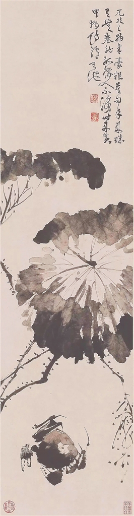 明代晚期,逐渐僵化的科举制度弊端丛生,一些不学无术之人通过歪门邪道名登甲第。他们跻身官场后,横行霸道,搜刮民脂民膏。徐渭在蟹画中表达了对这种现象的愤慨。比如在《荷蟹图》(或曰《黄甲图》)中,他用奔放的笔墨勾勒出一只在肥阔的荷叶下缓缓爬行的螃蟹,并在一旁题诗:“兀然有物气豪粗,莫问年来珠有无;养就孤标人不识,时来黄甲独传胪。”其中的“黄甲”指封建社会朝廷给中榜人员送去的用黄纸包装的录取通知书,而“传胪”指进士名单公布后宫中唱名的典礼。诗的大致意思是:螃蟹胆豪气粗、腹中空空,却偏偏有一副与众不同的模样。恰逢科场风气不正,让它能够顺利登第。后人普遍认为,徐渭作此画意在借螃蟹横行的形象,表达对科举制度的不满。