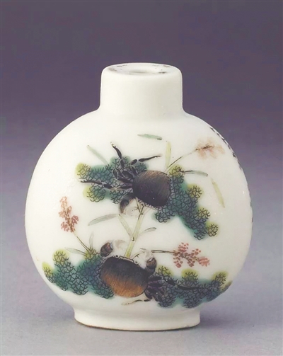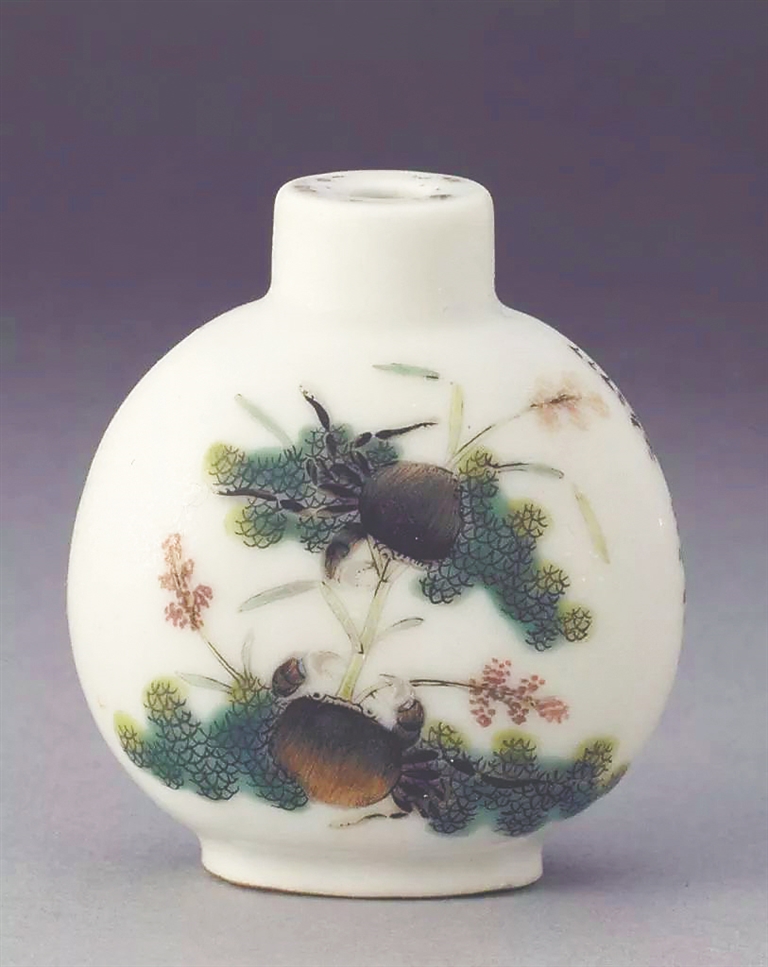 在一把制作于清道光年间的二甲传胪图鼻烟壶上,两只螃蟹围绕着几根芦苇穿梭游动,神情自在悠闲。螃蟹代表“甲”,“芦”谐音为“胪”,在深受科举影响的文人圈中,“二甲传胪”的含义不言而喻。不知这款小巧精致又充满吉祥寓意的鼻烟壶,最后成了哪位古代读书人的心头好。