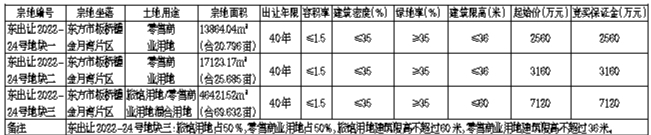 二、挂牌竞买人报名条件:(一)中华人民共和国境内外的法人、自然人和其他组织,除法律法规另有规定者外,均可参加竞买(注:失信被执行人不得参加本次竞买)。属境外机构(含港、澳、台地区)申请参与竞买的,按照规定需提交商务主管部门核发的《外商投资企业批准证书》和工商主管部门核发的《营业执照》。本次挂牌出让地块不接受联合竞买;必须在挂牌出让公告规定的时间内把竞买保证金存入东方市自然资源和规划局指定账户(以挂牌竞买保证金入账户时间为准)。(二)具有下列行为的法人及其控股股东和其他组织不得参加本次土地出让挂牌:1.在东方市范围有拖欠土地出让金行为,并未及时改正的。2.在东方市有违法利用农村集体土地建设商品住房、擅自改变土地用途等违法行为,并未及时纠正的。3.在东方市范围有非法占地、违法建设行为的。4.具有伪造公文骗取用地和非法倒卖土地、或非法转让土地使用权、或因企业原因造成土地闲置一年以上等违法违规违约行为且尚未结案或查处整改的。三、本次国有建设用地使用权挂牌出让设有底价,按照出价最高且不低于底价者得的原则确定竞得人。四、本次挂牌出让的详细资料和具体要求见挂牌出让文件。申请人可于2022年11月15日至2022年12月14日可从海南省建设用地使用权和矿业权网上交易系统(以下简称网上交易系统,网址:http://lr.hainan.gov.cn:9002)查看和打印。并按挂牌出让手册的具体要求报名参加竞买。五、缴纳竞买保证金的截止时间为2022年12月14日17时00分。经审核,申请人按规定缴纳竞买保证金,具备申请条件的,我局将在2022年12月14日17时30分前确认其竞买资格。六、本次国有土地使用权挂牌活动在海南省政府会展楼二楼省公共资源交易服务中心土地交易厅进行, 地块挂牌时间为:2022年12月6日8时30分至2022年12月16日11时00分。七、开发建设要求:(一)根据东方市旅游和文化广电体育局《关于出具东方市东出让2022-24号宗地国有建设用地使用权挂牌出让关联条件的复函》,以上地块用于旅游产业项目(其中地块三需建设五星级酒店),投资强度为500万元/亩,年度产值为450万元/亩,年度税收为15万元/亩。(二)以上地块项目达产时间为签订《国有土地使用权出让合同》后的3年内。(三)以上地块项目建成后,在同等条件下优先招录被征收集体经济组织成员共计12人,其中地块一:2人,地块二:3人,地块三:7人。招录条件按人事劳动部门规定执行,同工同酬并遵照竞得方规章制度管理。(四)以上地块若实施装配式建筑,应按装配式建筑有关规定执行。上述开发建设要求将列入《海南省产业项目发展和用地准入协议》。土地竞得人在签订《国有建设用地使用权出让合同》的同时,与东方市旅游和文化广电体育局签订《海南省产业项目发展和用地准入协议》。八、其他需要公告的事项:1.本次挂牌出让活动采取线上下载挂牌出让手册,线下提交报名材料和报价的方式进行,不接受电话、信函、邮件、电子邮件及口头竞买申请。2.按照《海南省自然资源和规划厅关于海南省土地交易市场竞买保证金可使用银行保函的通知》(琼自然资规〔2022〕7号)要求,竞买人可使用银行保函方式缴纳竞买保证金,保函应为不可撤销、见索即付保函,保函担保金额应不少于全额土地竞买保证金,保函的保证期限应当自保函开立之日起至招标拍卖挂牌交易活动结束后不少于60日,保函需在保证金交纳截止时间前2个工作日内送达我局。3.按正常工作时间(8时30分—12时00分,14时00分—17时30分)受理申请报名手续,节假日除外。4.本次挂牌出让事项如有变更,届时以变更公告为准。5.上述所有时间均为北京时间。九、查询网址:http://www.landchina.com/ (中国土地市场网);http://zw.hainan.gov.cn/ggzy/;http://lr.hainan.gov.cn。十、咨询方式:咨询电话:0898-25585295、68551218。联 系 人:陆先生 、林女士