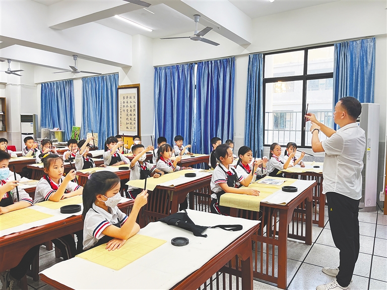 在启蒙课上,刘治永从文房四宝、毛笔的构造、书法字体等知识入手,激发学生们学习书法的兴趣。他告诉海南日报记者,“学校将书法课列为校内课后服务课程后,学生们报名参与的积极性很高,很快就被‘抢订一空’。”