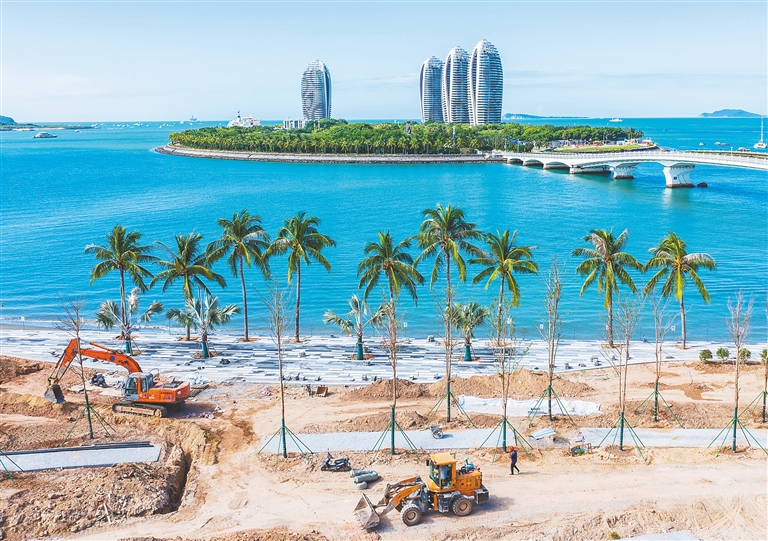 近日,在三亚凤凰岛桥头绿化工程建设现场,一派忙碌的场景,机器轰鸣,工人忙着铺砖、种树、焊接景观桥。目前,该项目正加快建设,一条崭新的三亚湾旅游风景带即将呈现。据了解,该项目将建设慢行道、跑步道、骑行道等,与三亚湾综合整治项目及滨海公园衔接。