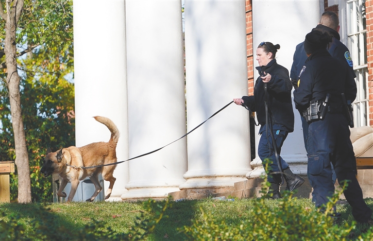 11月14日,警察在美国弗吉尼亚州夏洛茨维尔市弗吉尼亚大学枪击事件现场附近搜查。