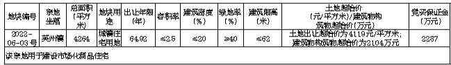 三、开发建设要求:(一)该宗地净地审核文件按海南省自然资源和规划厅《关于进一步规范建设用地使用权招标拍卖挂牌出让管理的通知》(琼自然资整〔2022〕244号)规定由县人民政府出具。(二)土地竞得人须严格按照《英州镇镇区控制性详细规划(局部修改)》进行开发建设。(三)该宗地属英州商业街历史遗留问题项目用地(住宅用地),不设定投资强度指标,年度产值及年度税收指标。(四)竞得人取得该宗国有建设用地土地使用权后,不得拆除已建现有建筑物,按相关规定完善报规报建、竣工验收、网签备案等相关手续并无条件负责为英州商业街项目已购房业主办理不动产权证书,已购房业主资格由县房产管理局进行认定。(五)项目用地按规定以挂牌方式供地确定用地单位后,由竞得单位按规定补办项目备案、建设项目环境影响评价手续。