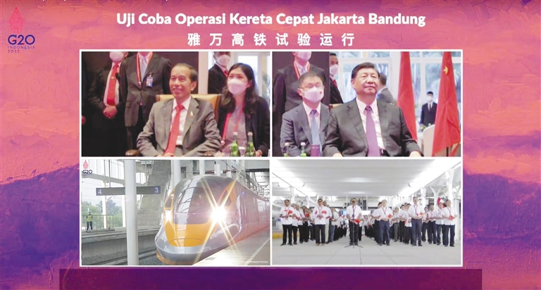 当地时间11月16日晚,国家主席习近平在巴厘岛同印度尼西亚总统佐科举行会谈。这是习近平和佐科共同视频观摩雅万高铁试验运行。新华社发(视频截图)