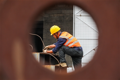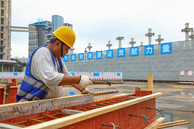 11月15日,在海口国兴大道的海南中心项目建设现场,来自全国各地的工人加紧施工,为海南第一高楼的建设做外围准备工作。这些工人常年在海南务工,哪里有需要,他们就去哪里。海南的许多重点项目工地上,都有他们洒下的汗水。