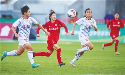 图为琼中女足队员黄巧祥(左二)正在抢球,她在决赛末段梅开二度将比分反超,她还被评为邀请赛最佳球员和最佳射手。