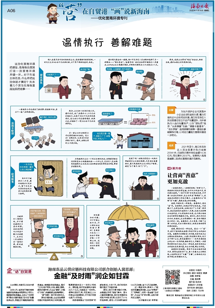 善意执行显温情。将其中的法治温度传递开来、营商态度保持下去,真心实意为企业解忧难,必能带来更多“双赢”“多赢”,让海南成为各类市场主体青睐的沃土。
