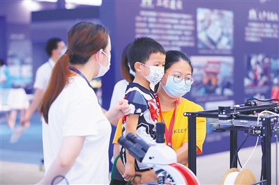 海南日报记者在现场了解到,主办方组织了91家参展单位、800余种展教资源,在主会场设有海洋科技互动体验、等比缩小型海洋机器人实操体验和航空航天主题展互动体验环节等。此外,还设有火箭模型、北斗组网模型、无人机、航模等,并配备科普讲解员与现场观众进行互动。