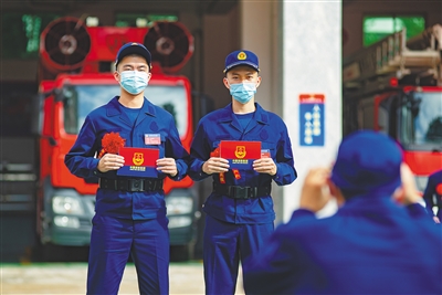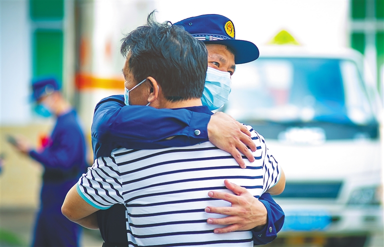 前往集训前,一位新消防员与父亲拥抱告别。 本版图片均由本报记者 封烁 摄