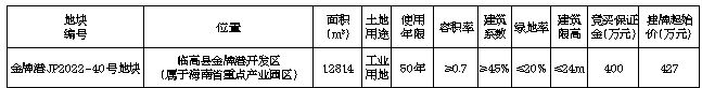 三、开发建设要求:(一)该宗地拟作为装配式产业项目使用,出让地块须统一规划、统一开发,建设须符合《临高金牌港经济开发区控制性详细规划》要求,生产配套满足规划要求,厂房风貌满足规划要求。(二)竞得人须在签订《挂牌出让成交确认书》后,5个工作日内与临高县工业和信息化服务中心签订《海南省产业项目发展和用地准入协议》,并严格按照《海南省产业项目发展和用地准入协议》约定内容进行开发建设,否则将承担相关违约责任。(三)竞得人出资比例结构、项目公司股权结构未经土地所在地人民政府批准不得发生变动。(四)竞得人取得土地使用权后,应依法建设使用土地和管理土地,切实履行《国有建设用地使用权出让合同》中的权利和义务。