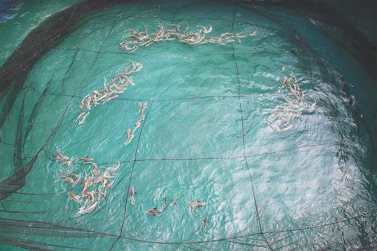 脚踩在捕捞网边缘的铁圈上,纪新和双手紧拽两边的吊绳,随着吊机缓缓下移,他进入黑色大网中,和潜水员王鹏将更多的鱼从大网赶入小网。