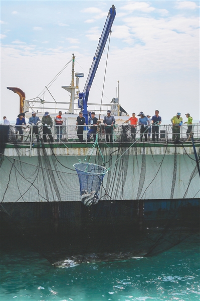 11月,海风中洋溢着丰收的喜悦。今年4月投放的3.5万尾军曹鱼苗,经过7个月的深海养殖,收获约75万斤军曹鱼。然而,要把几十万斤的鱼从10米深的养殖网箱中捞出来并非易事。船一到岸,船工们就忙碌了起来。心灵手巧善于固网的船员手持细梭,用细细的缆线将捕捞网的各连接处加固;用厚厚的塑料布围成的简易储鱼池中,一块块冰被吊机从船上运到此处;有船工沿着平台上的梯子到达顶部, 随后一张黑色的大网缓缓从十几米的高地沉入网箱中。