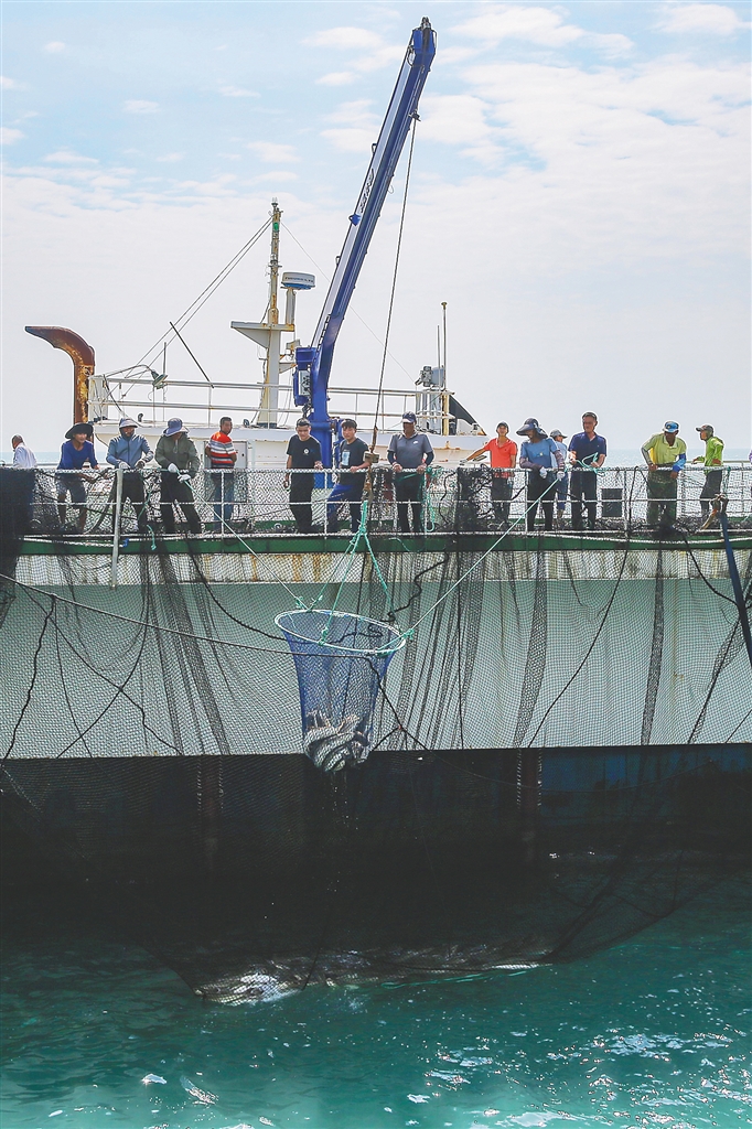 “这仅仅是捕捞的一种方式,还有更智能的方式。”熟悉平台情况的船工说,更为省力的是操作系统,将整个养殖网箱上浮起来。不过,要一次性把75万斤的军曹鱼运走,工程量巨大,船上也没有那么多人手。更重要的是,买家的船只一天仅运送5至8万斤渔获,为了保持新鲜,还是采取现捞现运的方式。“等过几日运得差不多了,我们就会将其上浮,将剩下的鱼都打捞上来。”