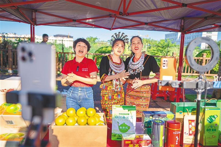 近日,在白沙黎族自治县七坊镇,主播直播销售红心橙等农产品。据悉,红心橙是白沙“两个万亩六个千亩”重点农业产业之一,今年种植面积已增至7000多亩,预计年产量达800万斤,辐射带动3000名农户实现务工增收。