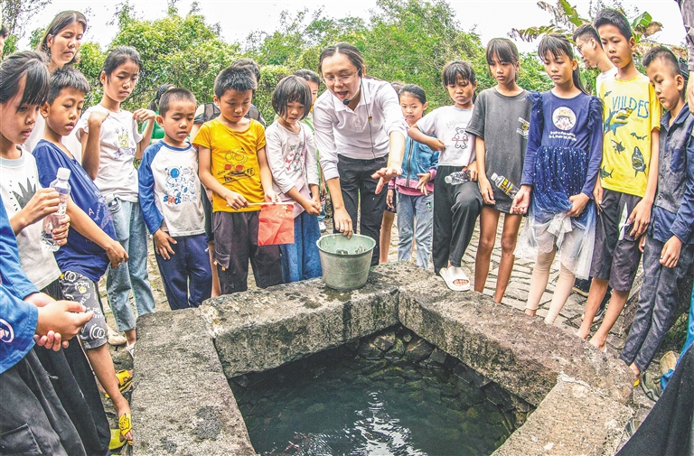 图为讲解员在木排村琼崖大南区抗日革命根据地红军用过的水井前,向小学生讲叙发生在木排的红色故事。特约记者 吴文生 摄