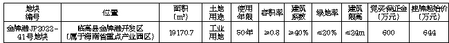 三、开发建设要求:(一)该宗地拟作为装配式产业项目使用,出让地块须统一规划、统一开发,建设须符合《临高金牌港经济开发区控制性详细规划》要求,生产配套满足规划要求,厂房风貌满足规划要求。(二)竞得人须在签订《挂牌出让成交确认书》后,5个工作日内与临高县工业和信息化服务中心签订《海南省产业项目发展和用地准入协议》,并严格按照《海南省产业项目发展和用地准入协议》约定内容进行开发建设,否则将承担相关违约责任。(三)竞得人出资比例结构、项目公司股权结构未经土地所在地人民政府批准不得发生变动。(四)竞得人取得土地使用权后,应依法建设使用土地和管理土地,切实履行《国有建设用地使用权出让合同》中的权利和义务。