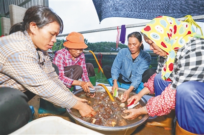 “这两天还有来自省外的1万多斤订单催着发货呢,大家加把劲,今天加班的工钱、餐补都记上了!”11月24日,在该基地菌菇加工车间,村民符妹英、符海珠等人正忙着采摘、冲洗、分拣菌菇,作为基地主管,年近六旬的村民符国华在仔细核对当天采摘、入库、发货数量的同时,不忘给大家鼓劲。