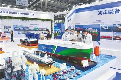 图为观众在海博会现场观看中国船舶集团展出的船只模型。新华社记者 梁旭 摄
