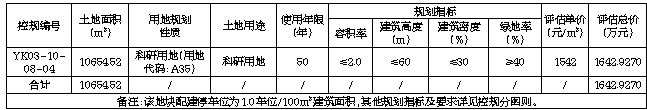 一、挂牌出让宗地基本情况和规划指标等要求:(一)挂牌出让宗地基本情况:本次挂牌出让宗地位于三亚崖州湾科技城控规YK03-10-08-04地块,面积10654.52平方米,用地四至及界址坐标详见地块勘测定界图。经核查《三亚市总体规划(空间类2015—2030)》(省政府同意入库版),该宗地用地规划性质为高新技术及信息产业园。同时,经核查《三亚崖州湾科技城控制性详细规划》,该宗地规划用地性质为科研用地(用地代码:A35),对应土地用途亦为科研用地。2022年11月15日,三亚市人民政府出具了《关于三亚崖州湾科技城控规YK03-10-08-04地块内约15.9亩用地具备净地出让条件的证明》,证明控规YK03-10-08-04地块内约15.9亩用地土地征收及“两公告一登记”工作已完成。我市崖州区人民政府已与被征地单位签订了《征收土地补偿协议书》,土地补偿款、安置补助费、青苗及地上附着物补偿费用等款项已支付到位,相关征地材料现存于我市崖州区人民政府。目前地块上的附着物已清表,无法律经济纠纷、土地开发利用规划条件明确、符合土壤环境质量要求。地块周边可以满足施工建设所需的水、电供应,相关设备、机械可以进场施工。该宗地具备净地出让的条件。经我局核查,该宗地不属于非法占地、违法建设行为已经处置到位并组织供应的土地。该宗地概况及规划指标等情况详见下表: