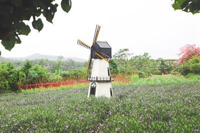 驱车沿海南中线高速公路行驶至南昆路口附近,一座颇具童趣的大风车引人注目。虽是11月底,风车所在的屯昌梦幻香山旅游区内,却是丁香吐蕊、草木清香。