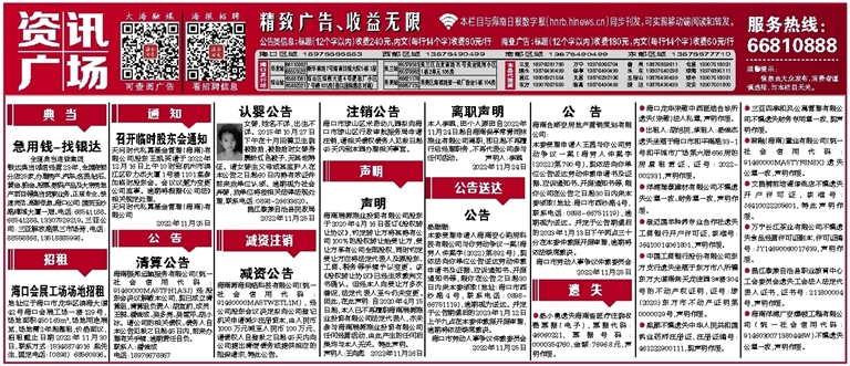 海口市琼山区米奇幼儿园拟向海口市琼山区行政审批服务局申请注销,请相关债权债务人见报日起45天内到本园办理相关事宜。