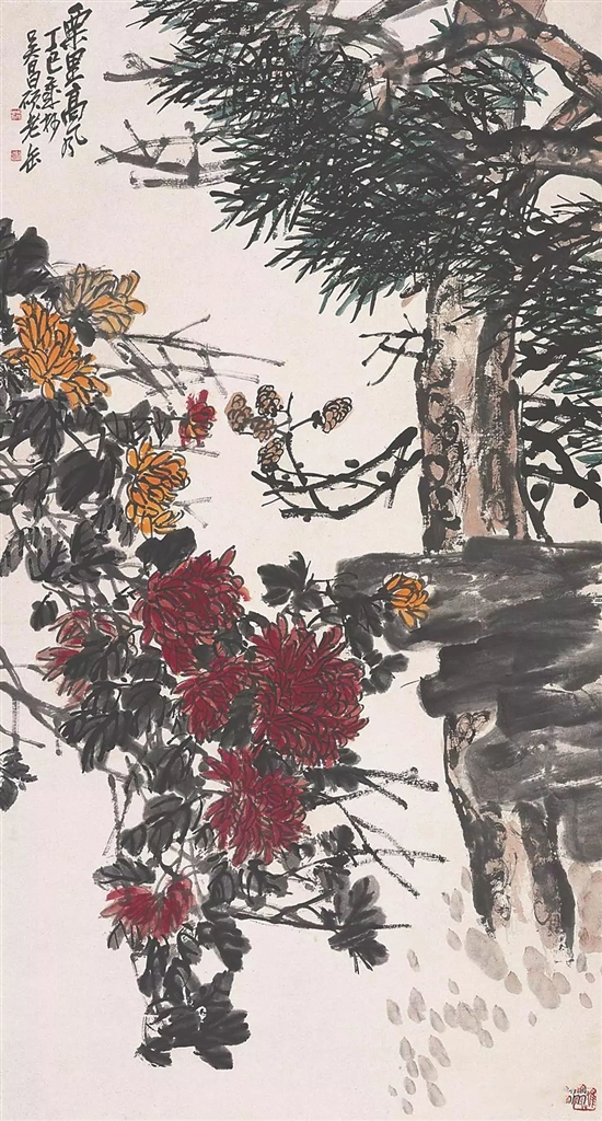 吴昌硕画菊更是抒发一种情怀。他16岁时,因太平军与清军战于浙西,全家避乱于荒山野谷中,弟弟妹妹先后死于饥馑。后又与家人失散,替人做短工、打杂度日,先后在湖北、安徽等地流亡数年。吴昌硕通过画菊表达他不愿寄人篱下的高傲精神,因为菊花凌霜傲雪,于众芳谢后迎风盛开,五色缤纷。他在题诗中说:“秋菊灿然白,入门无点尘。苍黄能不染,骨相本来真。”“枝瘦能傲霜,孤高夐无偶。” 他在《东篱佳色》题诗中感慨道:“既有隐逸名,何须寄篱下?惯受风雨欺,秋来摘盈把。”吴昌硕的《栗里高风》表明了自己的风骨。画面上一簇簇颜色各异、正在盛开的菊花扑面而来,右方岩石后面一棵松柏苍劲挺拔,高耸入云,苍松与菊花相映成辉,仿佛要与严霜作一番斗争。右下方凝重的湖石与左下方下曳的红菊形成动与静的强烈对比,分外精神,更显出此画的无限气势和大自然的勃勃生机。此画是吴昌硕以傲菊、劲松赞叹陶渊明“不为五斗米折腰”的高风亮节,更是对自己当年“弃官先彭泽令五十日”的自况。吴昌硕在56岁那年经人举荐出任安东(今江苏涟水)县令,为官仅一个月便挂冠南下,从此绝意仕途,潜心艺术。他晚年曾作《傲霜图》,图中用淡墨擦出两方巨岩,岩石右侧横陈着几枝粗壮的菊枝,几束盛开的菊花列于岩石前。菊花以浓墨勾出,显出无比的苍劲郁勃,表现了特有的深沉,既傲且庄的形象跃然纸上。他题诗:“南山高百丈,探秋时一上。篱花开烂漫,霜气更萧爽。寒香晚更奇,啸傲寄真想。根下丹泉流,泉甘菊苗长。”表达了自己矢志不渝的终生追求,并寄寓充满生机的未来。