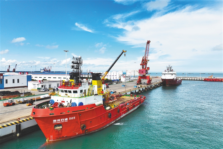 近日,位于澄迈的中海石油码头,服务油气勘探开发的作业货船正在进行补给。据了解,该码头依托当地港口的优良港池条件,充分发挥中心辐射作用,为海上勘探开发提供优良、安全、高效的服务。本报记者 武威 摄