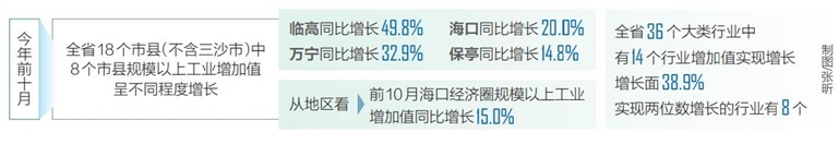 从市县看,前10月全省18个市县(不含三沙市)中,8个市县规模以上工业增加值呈不同程度增长,比例超四成。其中,临高同比增长49.8%,万宁同比增长32.9%,海口同比增长20.0%,保亭同比增长14.8%。从地区看,前10月海口经济圈规模以上工业增加值同比增长15.0%。