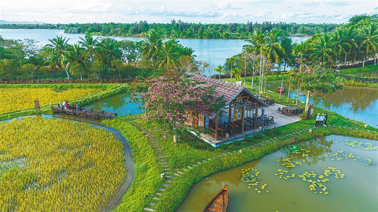 11月27日,在琼海市博鳌镇留客村,游客尽情享受田园风情。