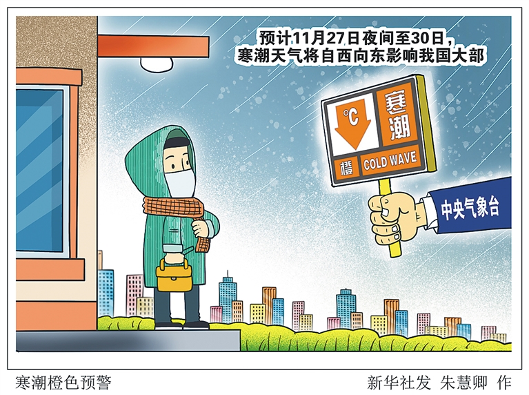 新华社北京11月27日电 (记者黄垚)中央气象台27日18时发布寒潮橙色预警,预计27日夜间至30日,寒潮天气将自西向东影响我国大部,造成剧烈降温、大风、沙尘和大范围雨雪天气。