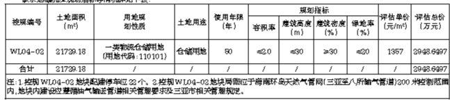 本次挂牌出让宗地位于三亚综合物流园区(一期)控规WL04-02地块,面积21729.18平方米,用地四至及界址坐标详见地块勘测定界图。经核查《三亚市总体规划(空间类2015—2030)》(省政府同意入库版),该宗地用地规划性质为保税物流园区。同时,经核查《三亚综合物流园区(一期)控制性详细规划》,该宗地规划用地性质为一类物流仓储用地(用地代码:110101),对应土地用途为仓储用地。