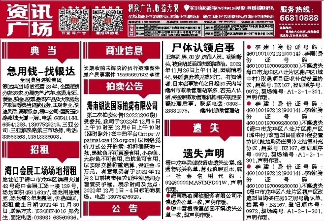 银达典当诚信经营23年,全国连锁分店25家,办理房产、汽车、名表、钻石、黄金、铂金、股票、数码产品及大宗房地产项目等典当贷款业务。正规专业、快速灵活、高额低息。海口公司:国贸玉沙路椰城大厦一层。电话:68541188、68541288、13307529219。三亚公司:三亚解放路第三市场旁,电话:88558868,13518885998。