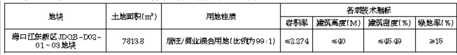 海口市江东新区JDQB-D02-01~03地块用地的规划指标情况详见下表: