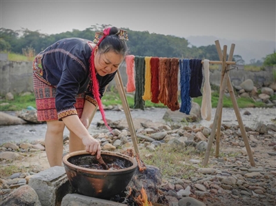 昌江黎族自治县石碌镇保突村的羊玉兰老人是黎族传统纺染织绣技艺省级代表性传承人,她12岁便从母亲、外婆那里学习手工染线技艺,从事植物染色已经50多年。羊玉兰坚持用陶锅煮线,认为这样染出来的颜色更好看。“手工染线太累了,很少有人愿意学。”她说,保突村一度只有她一人掌握染线技艺,好在女儿们跟着她学会了染线,还成立了工作室。